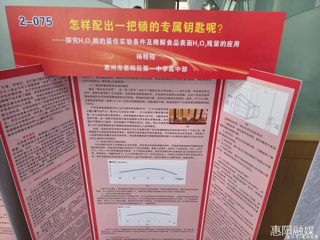 基于高中所学的生物学知识,杨程程将过氧化氢酶与过氧化氢的关系形象地比作“锁和钥匙”,并以此为切入点,系统探究过氧化氢酶降解食品表面过氧化氢残留的最佳实验条件,包括温度、PH值等因素。她还设计了可应用于日常生活的小实验,兼具趣味性与实用性,为相关工业领域的技术应用提供了有价值的参考。